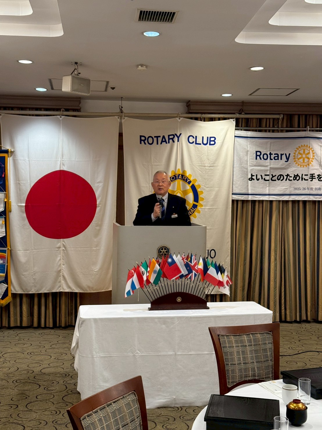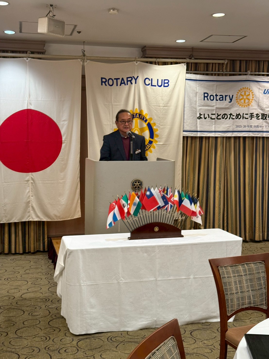 本日も例会にご出席いただき、誠にありがとうございます。いよいよ12月に入り、今年も残すところあとひと月となりました。街中にはイルミネーションが灯り、年の瀬の慌ただしさとともに、一年を振り返る季節がやってまいりました。さて、今月はロータリー活動においても行事が続きます。まず、12月6日・7日には伊豆修善寺のペドロドームにて、国際ロータリー2620地区の地区大会が開催されます。地区の仲間とともに、学びと交流の機会となることを楽しみにしております。